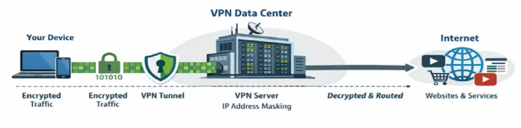 The VPN data center can be anywhere in the world. Your IP address is swapped with one from the data center (the outgoing connection), so it seems you’re in the state or country of the new IP address. This feature allows you to, for example, “unblock” American Netflix from anywhere in the world.